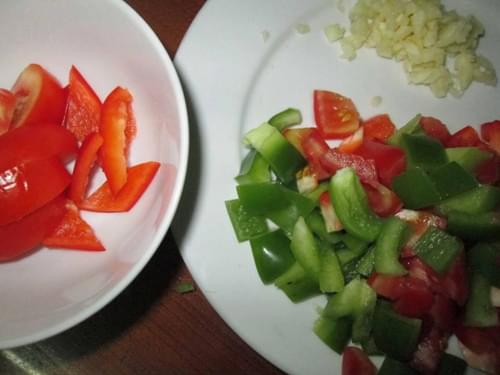 – Nước sốt: cho tỏi băm nhỏ vào chảo dầu ăn nóng sau đó cho cà chua vào đảo đều. Tiếp đến, cho ớt xanh đỏ, sau đó cho một chút tiêu bột, hành lá và thì là thái nhỏ vào