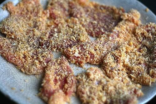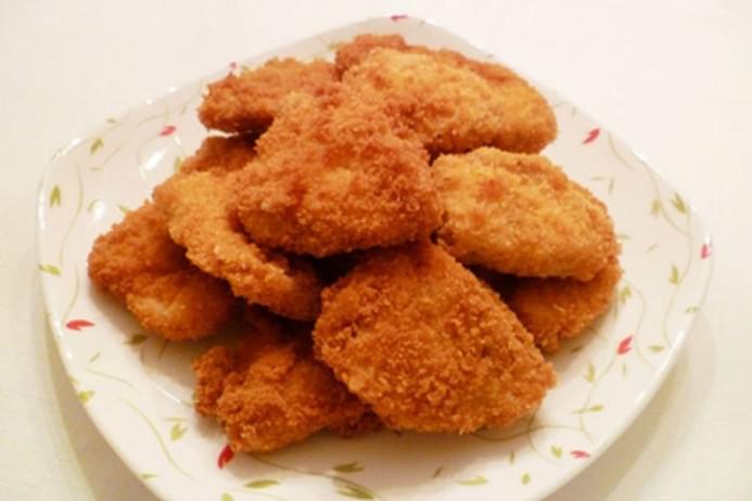 - Thịt đã lăn bột chiên xù cho vào chảo dầu nóng chiên ngập tới khi miếng thịt chín vàng, sau đó vớt ra để ráo dầu.
